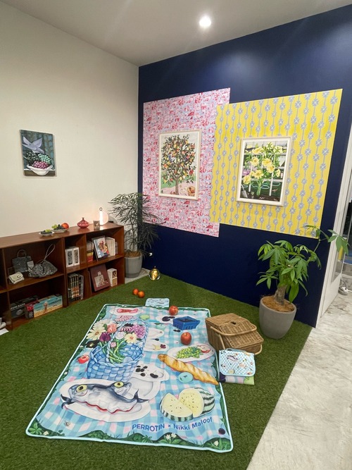 ニッキ・マルーフは、母性、時間、そしてその他の実存的なテーマを探るために、身近な家庭の世界をレンズとして用いる絵画、ドローイング、コラージュを制作しています。彼女にとって絵を描くことは、自身の潜在意識との対話の手段であり、絵具の質感や特定の色合い、パターン、イメージといった細部に注意を払うことで、その領域へとたどり着きます。マルーフの作品では、動物や異国の植物がシュルレアリスティックな情景に包まれて登場し、どこかに潜む暗さが、遊び心あふれる鮮やかな色彩と対比を成しています。